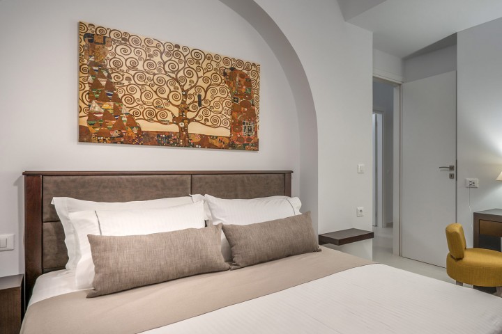 Wood, stone and white tones are prevalent both in the interior and the exterior of the villa. The bright, airy rooms are luxurious and finely decorated. There is a large bedroom with a 32 inch TV and two smaller double rooms. Each bedroom features a double bed and sophisticated furnishings. The soft earthy tones promote the serenity of the interior, which is characterized by an air of simplicity and attentiveness.